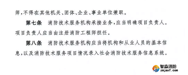 第七條 消防技術服務機構承接業(yè)務,應當明確項目負責人。項目負責人應當由注冊消防工程師擔任。