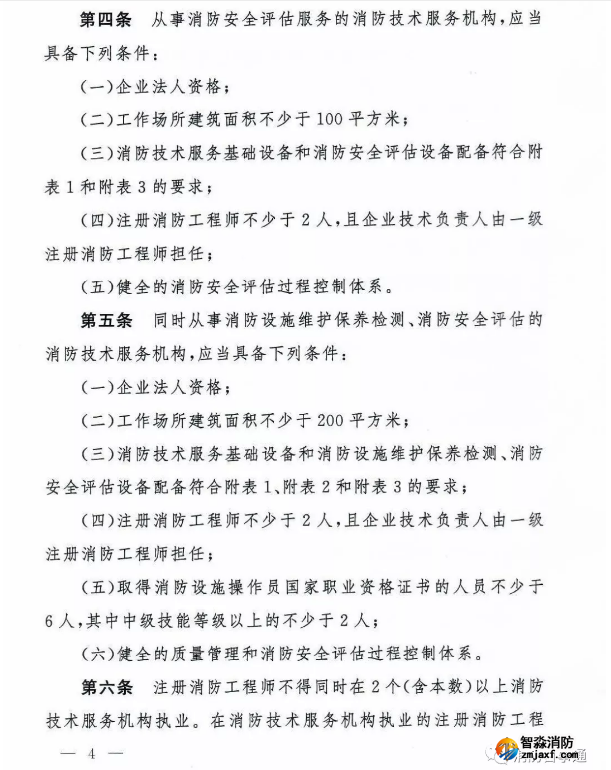 第五條 同時從事消防設施維護保養(yǎng)檢測、消防安全評估的消防技術服務機構,應當具備下列條件: