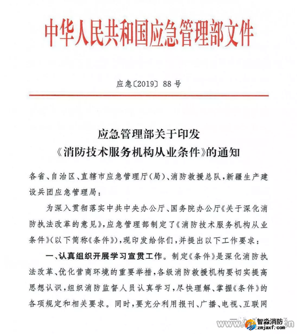 為深入貫徹落實中共中央辦公廳、國務院辦公廳《關于深化消防執(zhí)法改革的意見》,應急管理部制定了《消防技術服務機構從業(yè)條件》(以下簡稱《條件》),現(xiàn)印發(fā)給你們,并提出以下工作要求: