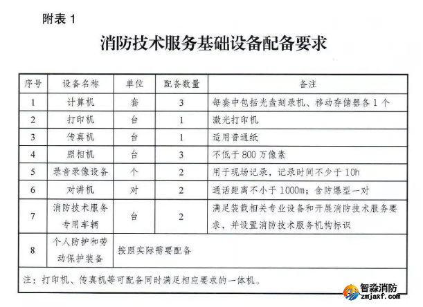 (三)消防技術服務基礎設備和消防設施維護保養(yǎng)檢測、消防安全評估設備配備符合附表1、附表2和附表3的要求;