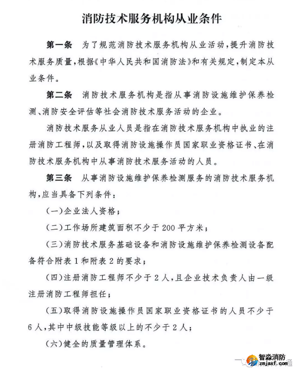 第三條 從事消防設施維護保養(yǎng)檢測服務的消防技術服務機構,應當具備下列條件:
