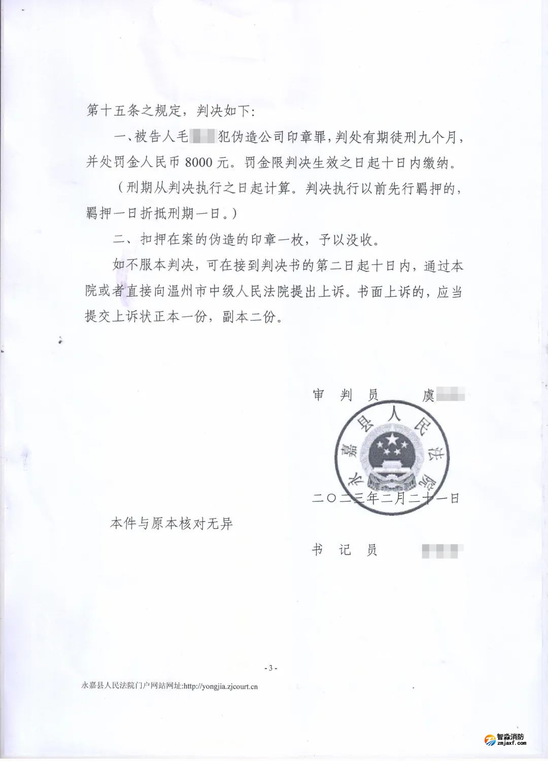 2023年2月21日永嘉縣人民法院對毛某偽造其所任職的消防技術(shù)服務(wù)機(jī)構(gòu)的公司印章,出具虛假消防檢測報(bào)告一案予以判決,當(dāng)事人毛謀因犯偽造公司印章罪被判處有期徒刑九個(gè)月并處罰金人民幣8000元。